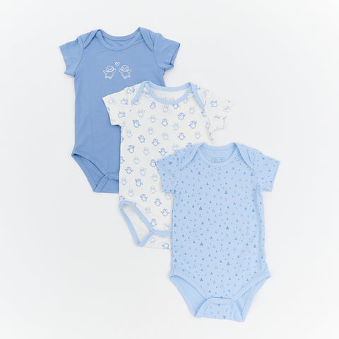 Our new essential bodysuit pack which features 3 unique designs each with envelope neck and easy leg snaps for quick and easy changing. Our breathable and thermoregulating babywear uses a blend of 95% Natural Bamboo and 5% Spandex making it super soft and easy to wear.