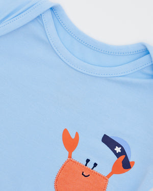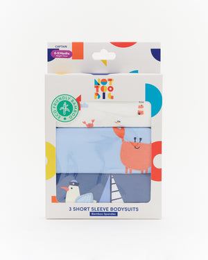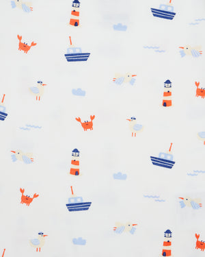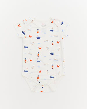 Set sail in comfort and style with our adorable Captain Bodysuit. Crafted from soft bamboo spandex, this bodysuit offers excellent breathability and stretch, keeping your baby cozy on any adventure. this soft bodysuit features playful prints of boats, lighthouses, seagulls, and crabs.