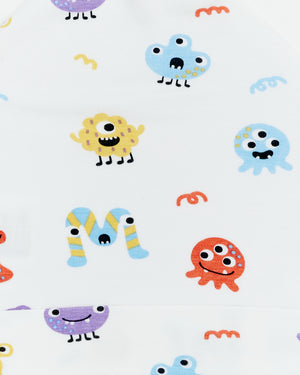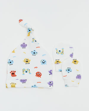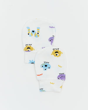 Complete the look with our Monster Mischief accessories set — a cozy hat and soft mittens designed to keep tiny heads and hands warm. Featuring matching monster prints, this set adds a playful finish to any outfit while ensuring comfort with bamboo-spandex’s natural softness.
