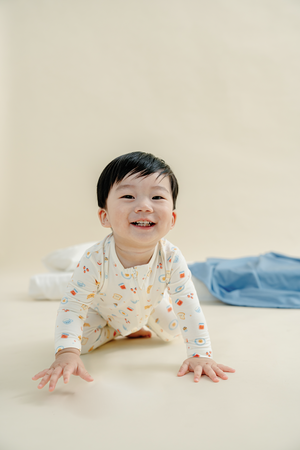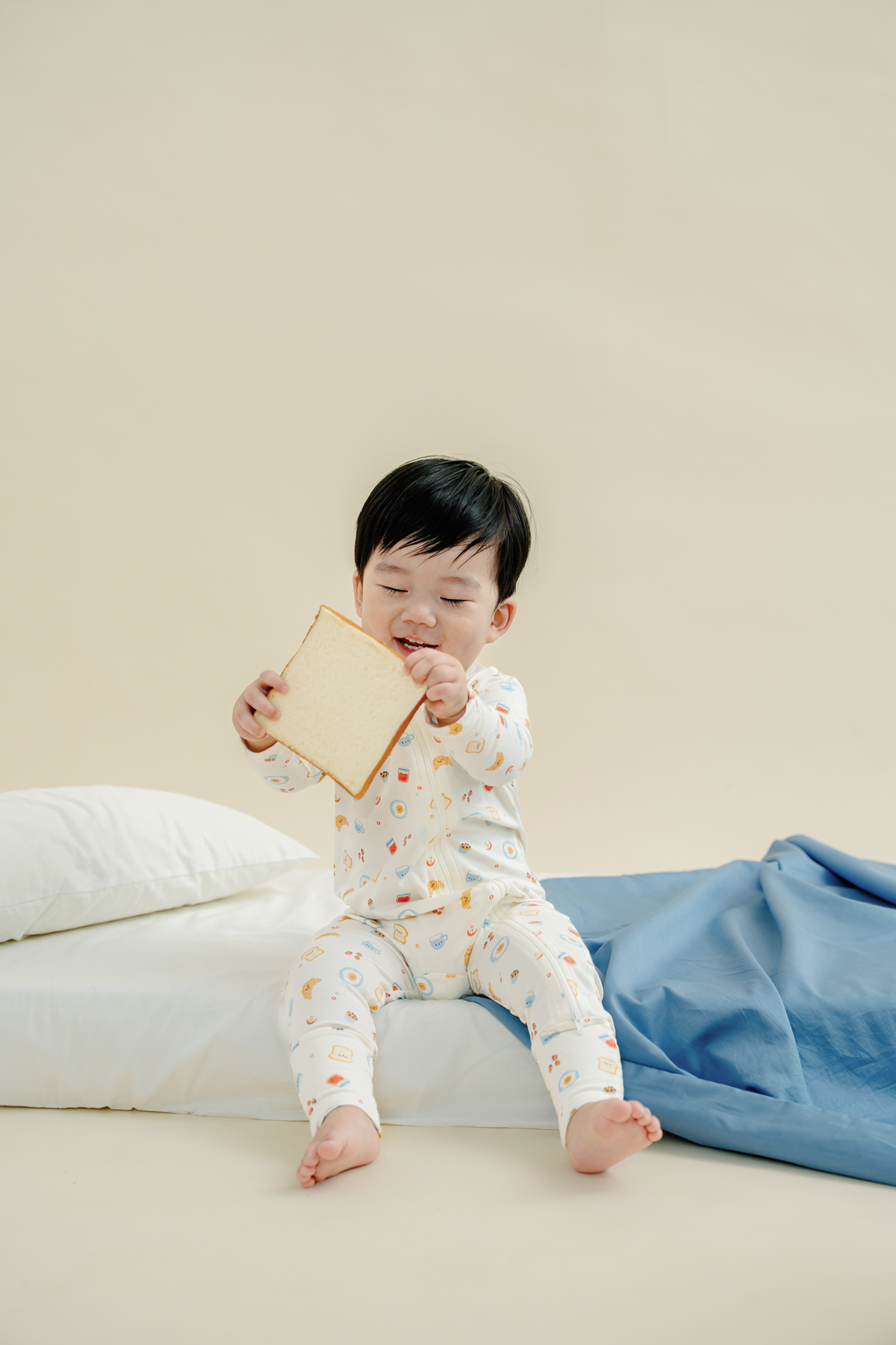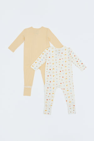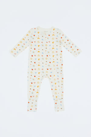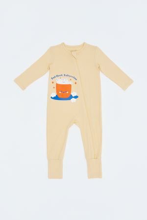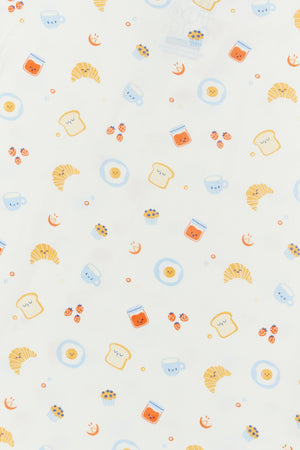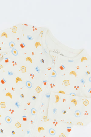 Designed for restful naps and cozy nights, the sleepsuits feature warm babycino elements paired with playful breakfast prints. Soft stretch bamboo fabric allows easy movement while maintaining comfort throughout sleep.
